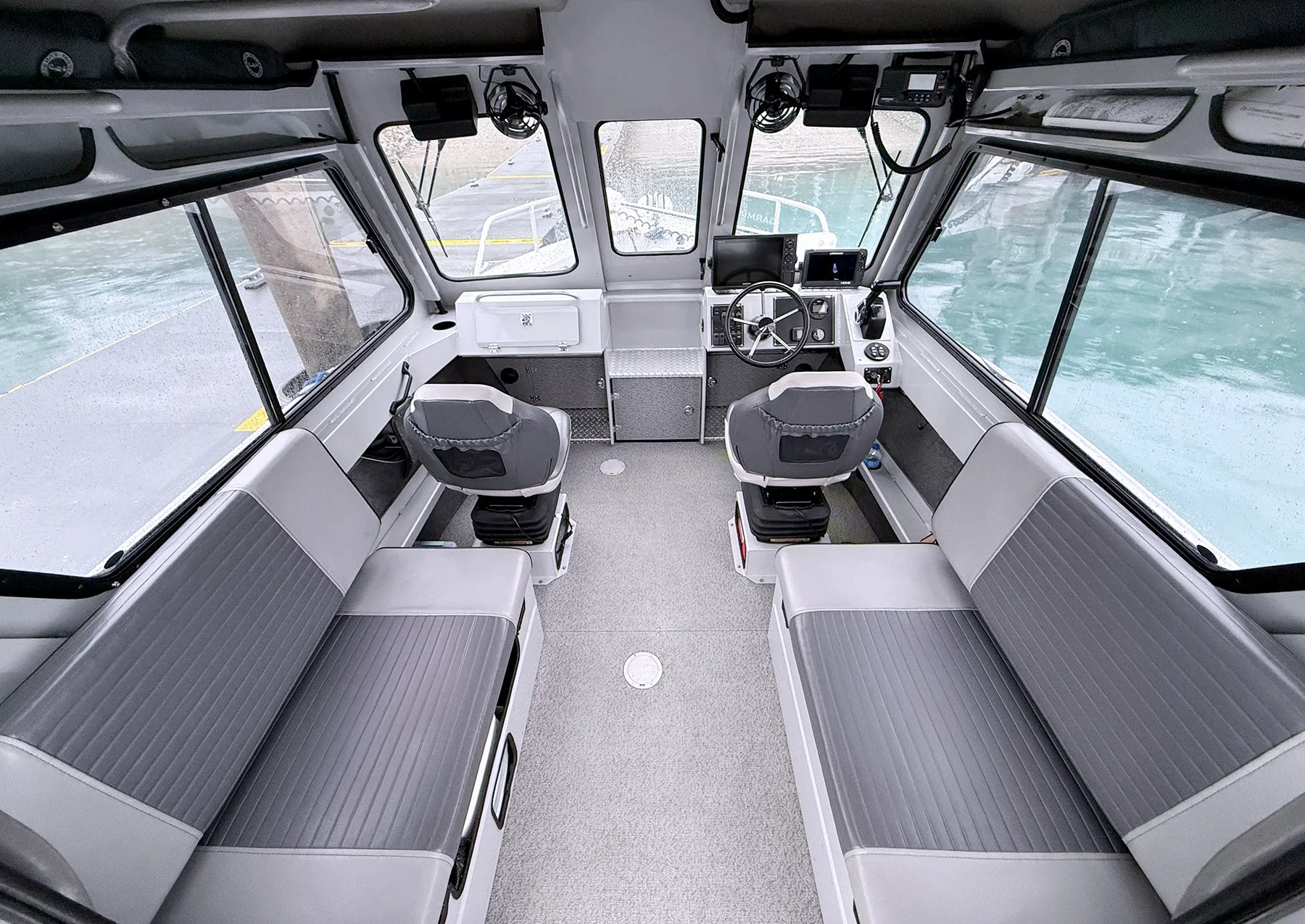 Stay dry in the heated cabin during inclement weather conditions, while still being able to have plenty of room on the rear deck or open the windshield hatch to get on the bow to get every angle. Large sliding windows on the starboard and port side provide access to the action right from your seat. There are suspension front seats and two large bench seats to accommodate a total of 5 passengers and captain. There is a porta-potty toilet when needed with privacy curtain.